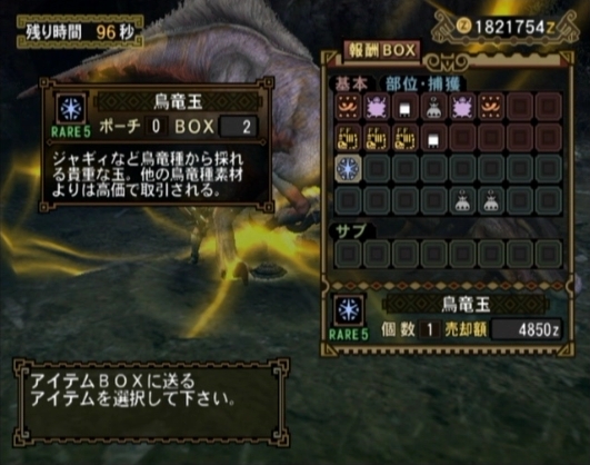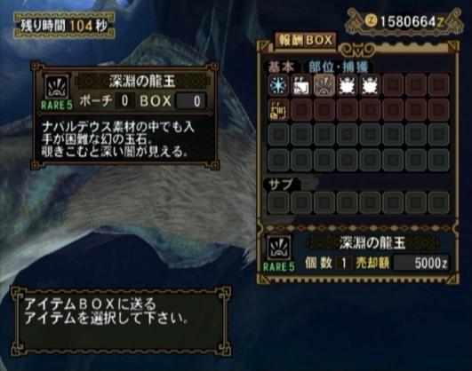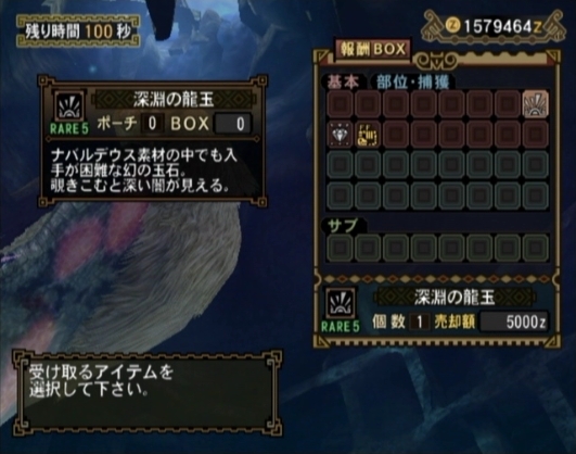 撃退→討伐して報酬を確認。『深淵の龍玉』が報酬画面に表示されて